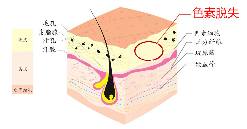 这类颜色变浅的疤痕,我们称之为色素脱失性疤痕。主要是由于烧伤后,皮肤深层受损,局部免疫功能失调,皮肤和毛囊的黑色素细胞内酪氨酶系统的功能减退或丧失,受损部位色素细胞分泌开始减少或缺失,损伤部位颜色就变浅了。