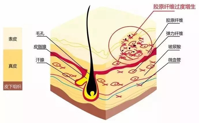 皮肤在受到深二度的烧烫伤时,真皮及皮下组织严重损伤,成纤维细胞聚集增生,胶原纤维、细胞、基质沉积并做无序排列,便会留下疤痕。由于深二度烧伤一般创面大、创口深,皮肤的全层受到损伤,在愈合过程中疤痕组织中的成纤维结缔组织便会大量聚集,便形成了增生性凸起疤痕。