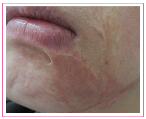 ![]() | 3、萎缩型:疤痕基底较为松动,与正常皮肤边界清楚,疤痕组织较薄,表皮易受破损溃破。 |